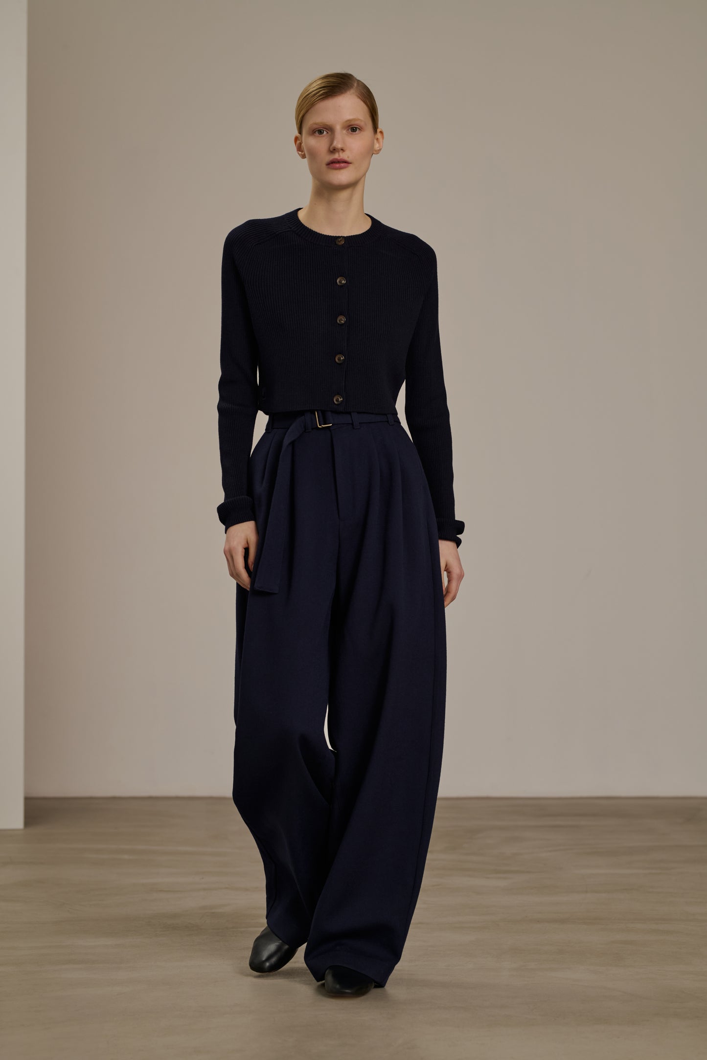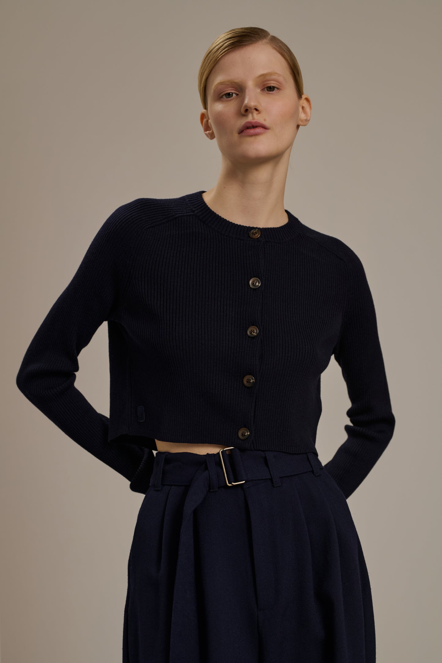 WALDEN is a ribbed stretch knit cardigan with a cropped cut. It can be worn directly on the skin or layered over a long shirt. It is part of our line of knits embroidered with the "S" monogram. This version is made from fine and warm merino wool.